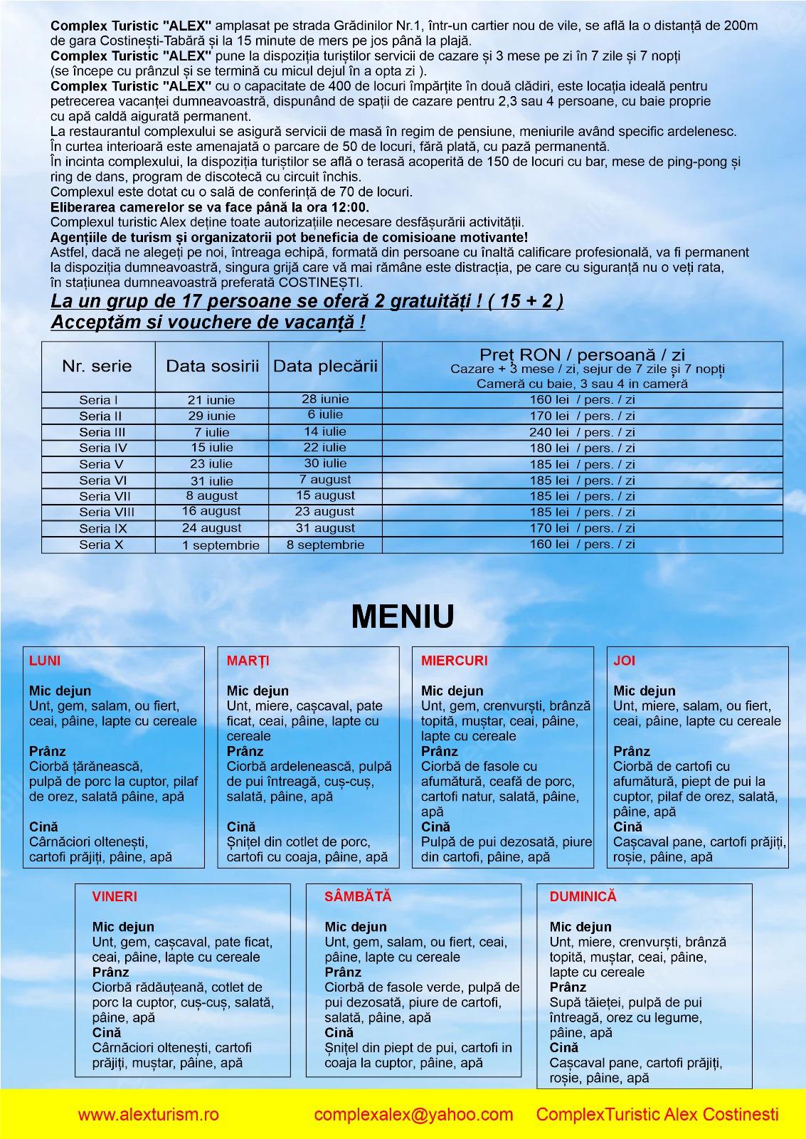 * Complexul Turistic Alex pune la dispozitia turistilor servicii de cazare si 3 mese pe zi in serii de 7 zile si 7 nopti (se incepe cu pranzul si se termina cu micul dejun in a opta zi);